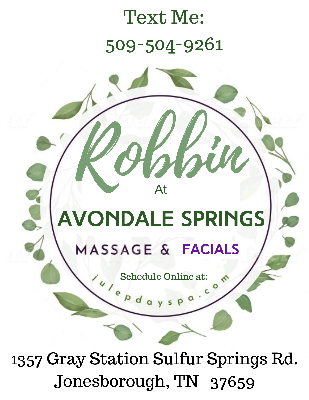 Robbin at Avondale Springs Spa - (Julep Day Spa) is located in the downstairs spa area at Avondale Springs Salon in the charming town of Jonesborough, Tennessee. My spa space offers a wide array of professional services designed to align your inner beauty with your outer beauty and promote self confidence, relaxation and Rejuvenation! From Spa Treatments and Massages to facials and Body Treatments, I am dedicated to providing you with a great experience. I’ve been a licensed Esthetician & Massage Therapist for more than 13 years. I’ve just recently relocated here to East Tennessee and I’m currently offering a variety of Facials, Massages & Spa Packages!